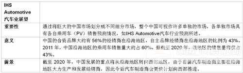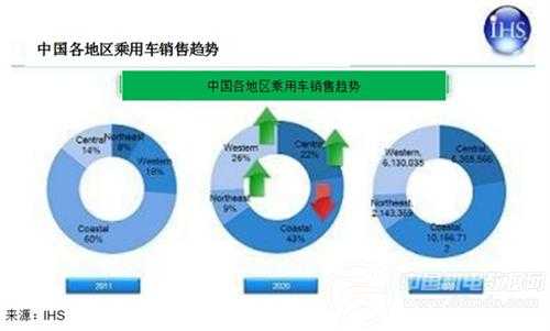 根据IHSAutomotive乘用车销售预测,截至2020年,中国西部的乘用车销售量相当于英国和巴西的总和;华中地区的销售量相当于印度;中国沿海地区的销售量相当于美国和韩国总和;东北地区的销售量相当于法国。