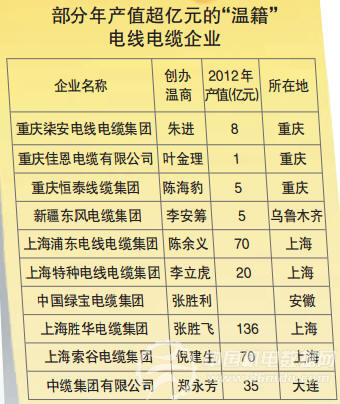 在百度文库的2012年中国电线电缆行业百强企业排名名单上,位列前两位的是中国绿宝电缆集团有限公司和上海胜华电缆集团有限公司,这两家企业背后的老板都是温州商人。大连温州商会会长、中缆集团有限公司董事长郑永芳告诉记者,近年来,我国经济持续快速发展,城市化进程的推进,大型电站、西电东送、电网改造等重大工程的建设,使得电线电缆行业也随之保持较高的增长速度,而较早进入这一领域的温州人获益匪浅。