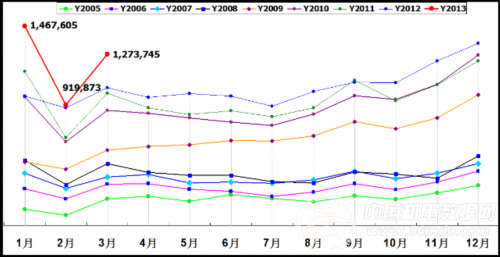 很多厂家利用春节长假期间,为将上市的新车型进行生产设备改造或调整,节后进行试生产和产能爬坡,因此3、4月份是新车型比较集中上市的时候,使市场有所放大。清明节高速公路免通行费的月底购车潮与季度末压库重叠也使销量大增。在同比少2个工作日的情况下,3月份狭义乘用车的同比零售和批发销量分别增长19.1%和16.5%,说明产能和市场均在高速增长。但汽车销售金额增速同比下降,这是由于进口车和重卡销售下降,而入门级的乘用车畅销所致。实际产销量统计,一季度占汽车产销量2/3的国产狭义乘用车零售销量同比增长高达24.3%,引起政府对汽车调控的担忧。3月钓鱼岛平静,加之日本财年在3月底,日系企业3月市场大增,但内资企业市场占有率环比连续2个月下降。3月经销商库存增加了7万多辆。