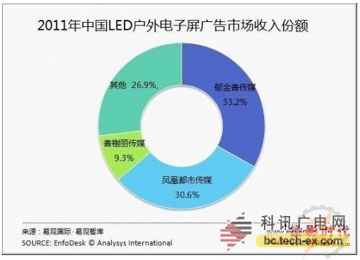 2011年,中国LED户外电子屏广告市场领先者仍占据着明显的份额优势,郁金香传媒占据33.2%的市场份额,继续位列首位;凤凰都市传媒后来居上,在广告收入上连攀新高,占据30.6%的市场份额,较2010年增加了7个多百分点;香榭丽传媒市场份额为9.3%;其他运营商市场份额则占到26.9%。