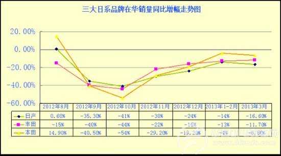 然而,刚刚出炉的3月份销量数据,却让这份高兴显得有点儿早了。根据厂商公布的数据,三大日系品牌中,日产汽车3月在中国新车销量同比减少16.6%,本田同比减少6.6%,丰田汽车则减少了11.7%。