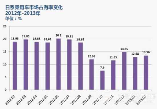 中国汽车工业协会的数据显示,去年钓鱼岛事件爆发以来,日系乘用车整体市场份额迅速从19%左右掉至10月份的最低值7.6%,到去年底,原本有一个明显的回升趋势,但随后又在今年1、2月份掉头往下,有所反复。