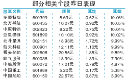 相对于股指的震荡收低,军工板块和船舶制造板块却呈现井喷的状况。军工板块整体上涨2.73%;而船舶制造板块更是整体上涨5.39%。军工板块中,抚顺特钢、北方导航、航天通信和航天科技涨停,此外,哈飞股份、西飞国际、中国卫星等股票涨幅也超过5%;船舶制造板块共有8只股票全部收红,其中亚星锚链收于涨停板。