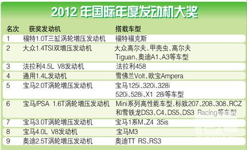 近日,2012年国际年度发动机大奖结果公布,评测的发动机主要针对排量1.6升到4.0升的发动机,并选出9款发动机作为此奖项的得主。