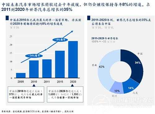 中国的汽车市场目前已经是全球最大。我们估计未来十年,中国汽车市场还会再翻番。2011-2020年间的总增长将占到同期全球汽车销量总增长的34%,中国市场销量将超越整北美市场(1,680万辆)和欧洲市场 (1,990万辆),成为全球第一区域市场(见图1)。