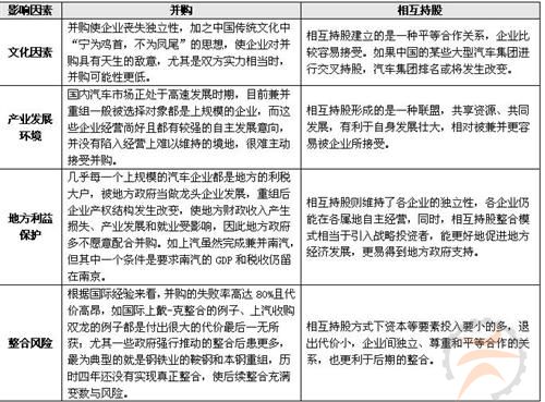 金融危机影响下,我国正积极推进汽车产业整合,但理论和实践都说明,并购不是唯一的模式。结合我国实际情况,通过对文化因素、产业发展环境、地方利益保护、整合风险等几个维度的对比分析,可以发现,在我国相互持股整合模式或更具有现实性和可操作性。