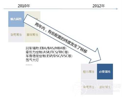 通过对某一级别的乘用车市场进行分析,我们可以看出:有些配置在2010年还属于有魅力的配置,而到了2012年,这些配置已经被消费认为是必要的配置了。同时最近的研究也发现,随着科技的发展和竞争的加剧,这一周期正在有逐步缩短的趋势;