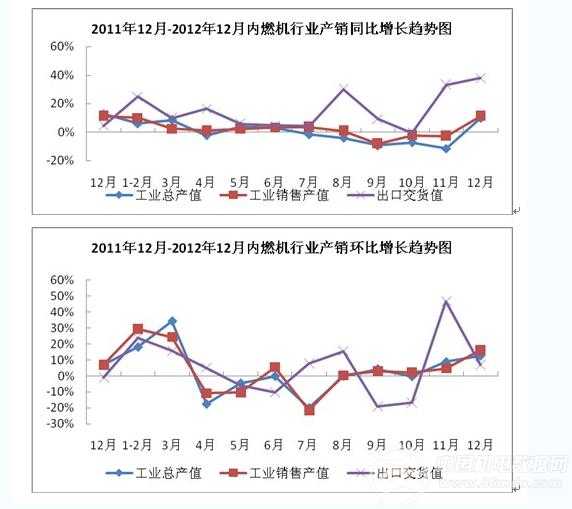 2012年12月,我国内燃机行业的工业总产值及工业销售产值的同比增速均比上月仍然有所小幅上升,出口交货值的同比增速则有小幅度上升。与此同时,工业总产值、工业销售产值的环比增速也均比上月有小幅度的上升。出口交货值的环比增速则比上月有大幅度下滑。