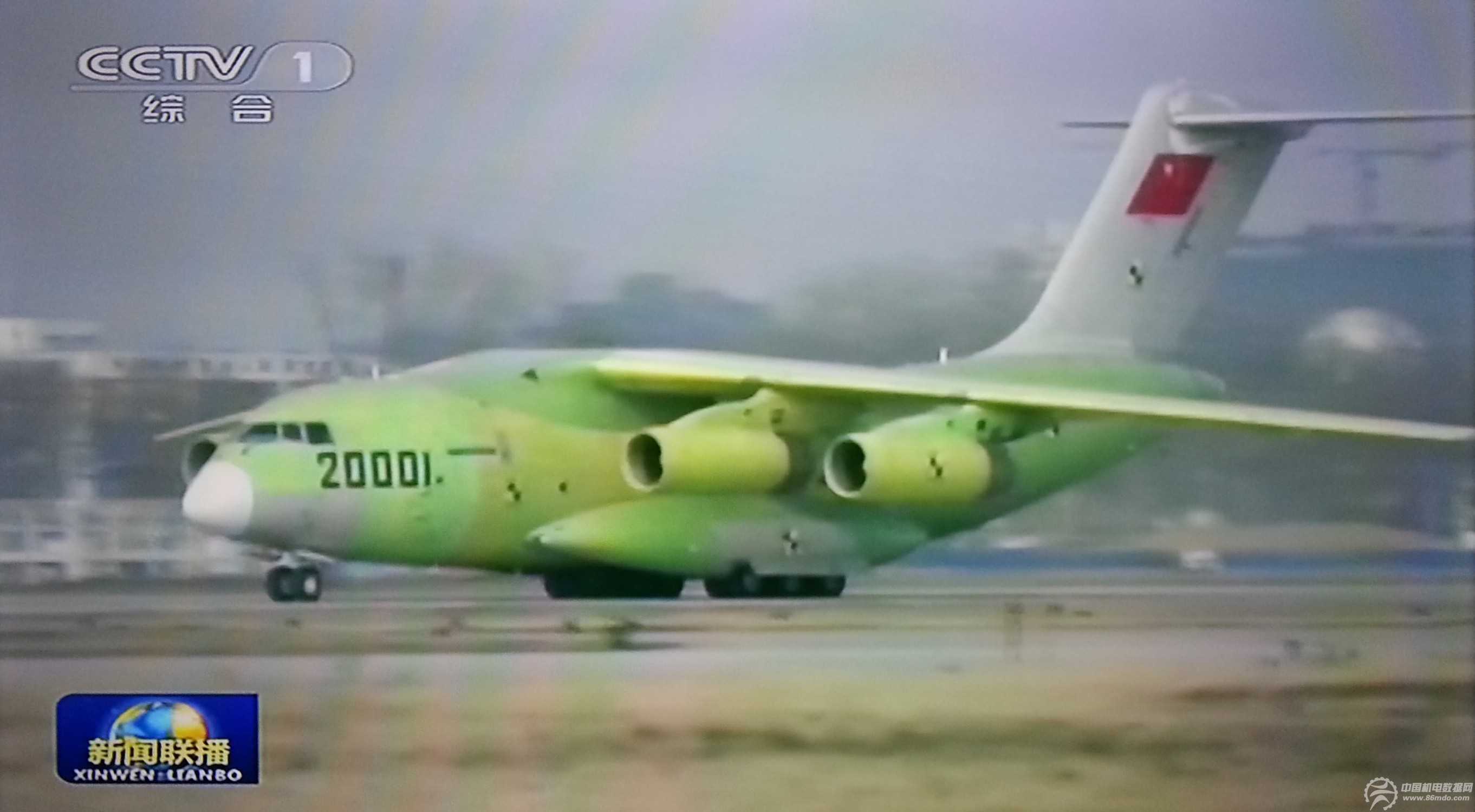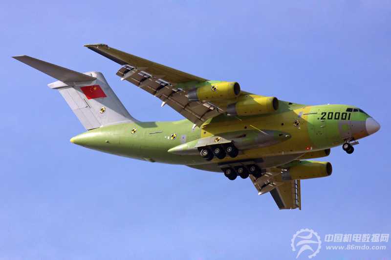 2013年1月26日下午14时许,中国自主发展的运―20大型运输机首架原型机20001号首次试飞取得圆满成功,首次试飞大约持续了一个小时。该型飞机是中国依靠自己的力量研制的一种大型、多用途运输机,可在复杂气象条件执行各种物资和人员的长距离航空运输任务。