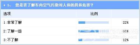 目前,世界卫生组织已将车内空气污染列为威胁人类健康的主要来源之一。但调查1的结果显示,现实中人们对车内污染危害的了解程度并不十分理想:只有少数人(占比22%)表示非常了解,而大多数人仅是耳闻,多达66%的参与者属于此类,剩余12%的参与者则根本不了解。