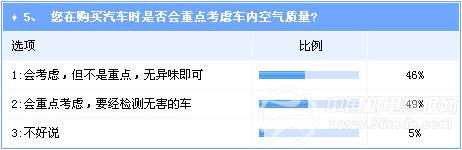从调查5的结果来看,消费者购车前是否考虑车内空气质量的问题基本已经没有异议,但在考虑程度上却有不同。其中,认为车内空气不是重点,只要车内无明显异味即可的消费者占比46%,而更看中身体健康,会重点考虑车内空气质量,只选择经过检测无害汽车的消费者仅稍占上风,占比49%。
