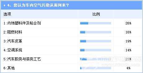 调查4的结果显示,内饰塑料件、漆胶类工艺以及汽车皮革被认为是车内空气污染的主要来源。这与实验证明的结果同样也接近。