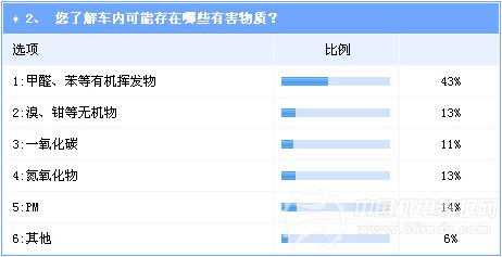 在调查2中,我们列出了目前已经被证实的车内存在的有害物质,以了解人们对各类物质的认知程度。结果显示,绝大多数的人认为车内污染的罪魁祸首就是甲醛、苯等有机挥发物,支持者占比43%。另外,PM、溴钳等无机物、氮氧化物、一氧化碳等的知晓度则相对平均,均稍稍超出10%。另有6%的参与者选择了其他。