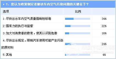 而出台措施限制可能造成车内空气污染的原材料及某些工艺的使用也尤为重要,目前美国、日本、德国等汽车强国都对汽车制造所使用的材料和车内空气中挥发性有机物的浓度都设定了严格的标准。比如美国环保局要求汽车制造厂所使用的材料必须申报,并必须经过环保部门审查以确保对环境和人体危害程度达到最低点后才能使用,申报者一旦违反规定,将负担巨额的罚款,还要召回产品清理污染,主要负责人甚至会被判刑。这是从源头控制车内空气污染的方法。这一选项在调查7中获得了24%的投票。