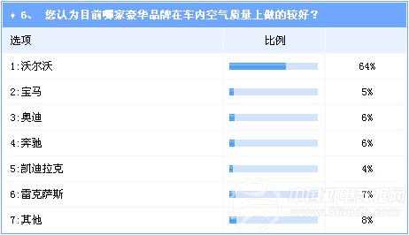 今年初央视曝光了德系豪华车车内空气污染等问题,使得民众认识到这一问题不仅仅存在于普通的品牌汽车中,而是包括豪华车在内整个汽车行业亟需正视和解决的问题。调查6中对目前在售的豪华品牌车内空气质量进行了调查,结果显示瑞典品牌沃尔沃以绝对优势领先其他竞争者。64%的业内人士认为沃尔沃在车内空气质量上比其他豪华品牌好。