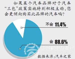 据了解,有王先生这样心理的消费者并不在少数,这也导致了“十一”期间车市客流量大增。不过,走访中记者发现,与没有提前行动的企业相比,那些在10月1日前就已开始实施汽车“三包”政策的品牌更受消费者青睐。汽车之家网站一项最新调查显示,88.6%的消费者更倾向于购买对汽车“三包”态度积极车企的产品。