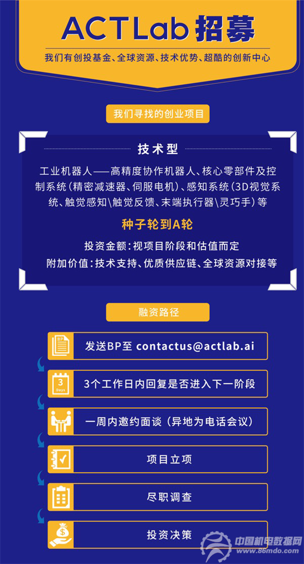 近期,ACT Lab2018年BP项目正在火热征集中(详情请查阅 微信公众号ID:ACT Lab)主要集中在工业机器人——高精度协作机器人、核心零部件及控制系统(精密减速器、伺服电机)、感知系统(3D视觉系统、触觉感知\触觉反馈、末端执行器\灵巧手)等技术型BP。欢迎全球所有机器人及人工智能相关领域的创业者报名。