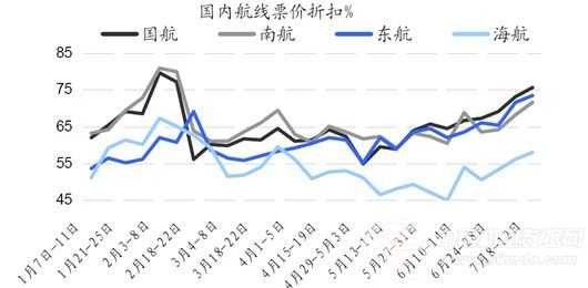 各航空公司国内航线票价折扣比较 资料来源:民航订座系统,第一创业证券研究所从三大航空公司中报看,虽然上半年国内经济增速放缓以及高铁联网对航空业造成冲击,但三大航空公司仍然实现净利润21.84亿元。盈利的原因并不是因为企业在主业经营上取得重大突破,而是得益于37.28亿元的汇兑收益。
