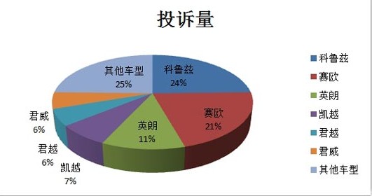 我们将所有投诉进行分类整理,其中涉及雪佛兰科鲁兹的案例48例、涉及赛欧的案例41例、涉及别克英朗的案例22例、涉及凯越的案例14例、涉及君越的案例11例、涉及君威的案例11例。