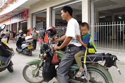 9月5日,广东阳春校车事故发生地附近的东方世纪之星幼儿园门口,一名家长骑摩托接孩子回家。 新华社记者 扶庆 摄