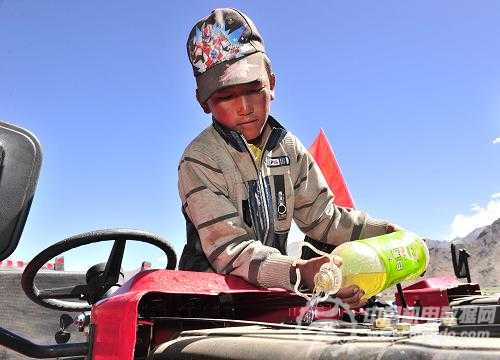 6月17日,西藏白朗县14岁的普布旦增为自家新购置的拖拉机加油。当日,西藏自治区日喀则地区白朗县的农民领到了今年首批购置的371台拖拉机。这批拖拉机每台售价2万元。在获得县政府提供的每台7000元的农机补贴后,农民只需个人出资1.3万元。