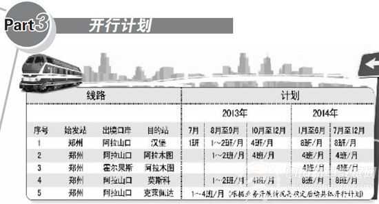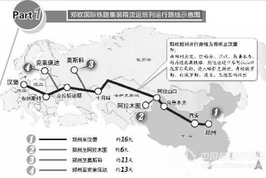 7月17日,在郑州举行的郑欧国际铁路货运班列开通发布暨推介会宣布,由郑州开往欧洲的国际铁路货运首次班列,将于18日从郑州铁路集装箱中心站驶出,终点为德国汉堡。全程10214公里,运行时间16天。这是中国内陆地区又一条直达欧洲的铁路货运大通道。