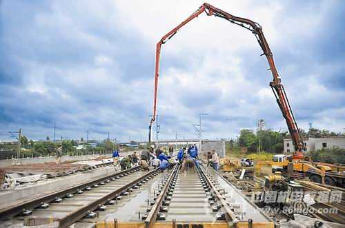 据工程指挥部负责人介绍说,混凝土浇筑是高速道岔建设的最后一道工序,该工序完成后,向北到绵阳的铺轨通道就可以打通,“再有40多公里,就能铺轨到绵阳。”