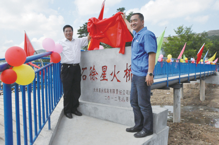 李维谦代表企业与天水镇及石徐村领导签署了移交协议,将该桥的相关建设资料移交给了石徐村。图为李维谦(右一)和天水镇党委书记共同为石徐星火桥揭牌,并为石徐星火桥通行剪彩。