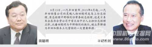 自董长征出任丰田中国副总裁后,丰田的人才本地化战略已经展开。上周,一汽丰田宣布,经股东双方协商,一汽丰田董事会决定,从2013年8月起,一汽丰田销售公司的灵魂人物田聪明走马上任总经理,原总经理平野雅则任常务副总经理。