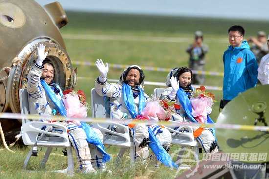 内蒙古四子王旗,北京时间6月26日9时41分许,神舟十号飞行乘组3名航天员聂海胜、张晓光、王亚平,在内蒙古中部草原“神十”任务主着陆场结束为期15天的太空之旅,从飞船返回舱健康出舱,由太空家园返回到地球家园。