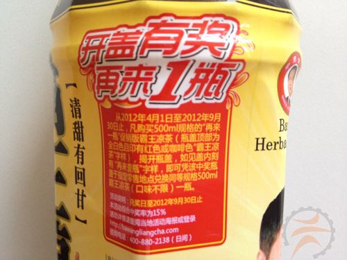 这位消费者向记者展示了他从超市买来的两瓶“霸王凉茶”(500ml)。该款饮料在包装说明中用红底黄字标注的兑奖规则为:“从2012年4月1日至2012年9月30日止,凡购买500ml规格的‘再来一瓶’促销版霸王凉茶(瓶盖顶部为全白色且印有红色或咖啡色‘霸王凉茶’字样),掀开瓶盖,如见盖内刻有‘再来一瓶’字样,即可凭该中奖瓶盖于指定零售地点兑换同等规格500ml霸王凉茶(口味不限)一瓶。”