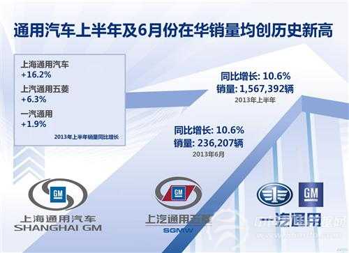 6月份,通用汽车在其最大单一市场中国销售了236, 207辆汽车,在2012年6月213,495辆的基础上同比增长10.6%,创历年6月最佳成绩。上半年累计销量同样增长10.6%,较之去年同期的1, 417,047辆提升到1,567,392辆新高。
