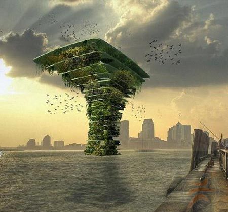 设计灵感来自亚马逊河巨型浮萍植物,最终将设计成一个直径1000米的城市。四面围墙和建筑屋顶覆盖草坪,中有微型绿洲和湖泊,旁边围绕三座人造山脉。该城被设计为自给自足,全部物质可循环利用,采用清洁能源。这个“末日城市”在水下设有灾难处理中心,灾难发生时,将启动程序漂移到安全地带。但它只能容纳5万人,预计2100年建好。