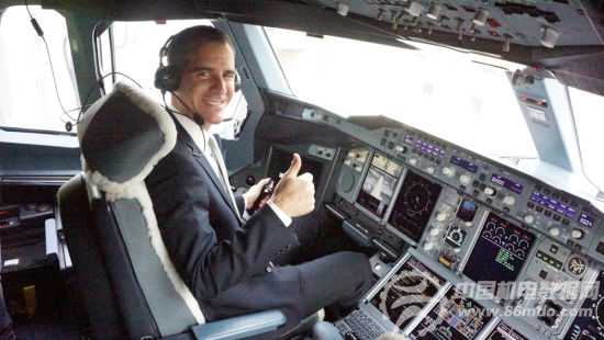 洛杉矶市长贾塞提先生在阿航A380客机的驾驶舱参观体验