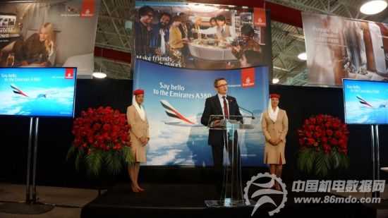 阿联酋航空商业运营高级副总裁休伯特·弗拉赫先生在A380抵达洛杉矶后发表演说