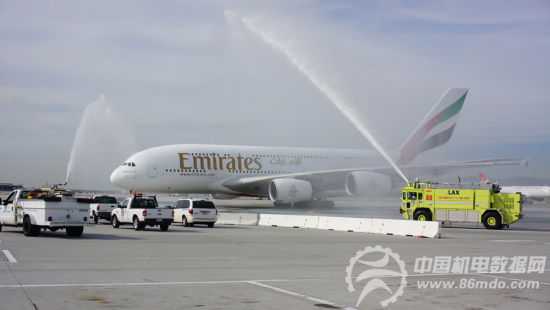 洛杉矶国际机场举行水门仪式,庆祝阿联酋航空A380客机飞抵洛杉矶
