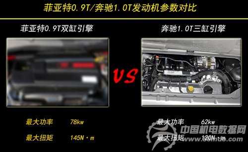 奔驰旗下微型车所搭载的1.0T三缸涡轮增压发动机,最大功率62kw,最大扭矩120N m。与之相比,虽然菲亚特的0.9T双缸涡轮增压引擎的排量较低,但在动力参数上均优于上述三缸发动机,其中最大功率及最大扭矩分别高出16kw和25N m。