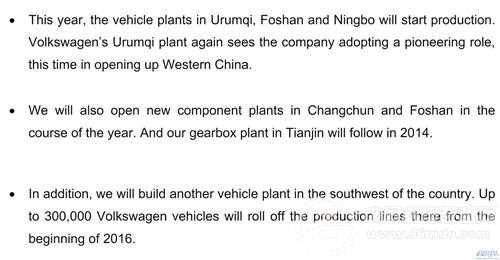 1、今年大众位于乌鲁木齐、佛山和宁波的工厂将开始投产运行。其中乌鲁木齐工厂成为中国西部整车工厂中的先锋角色。2、今年接下来时间里大众将在长春和佛山开张新零部件工厂,到2014年大众位于天津的DSG变速箱工厂将投产。3、大众汽车将在中国西南地区再次兴建一座整车厂,2016年投入生产运行,产能可达300,000辆/年。
