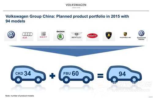 大众(中国)投资公司主管财务的执行副总裁穆勇(Jrg Mull,或作“Joerg Mull”)在报告中披露,大众计划到2015年在华销售94款车型,包括34款CKD本土组装车型,以及60款进口车型,覆盖大众乘用车、奥迪、斯柯达、保时捷、西亚特、大众商用车、宾利、兰博基尼和布加迪等多个品牌。