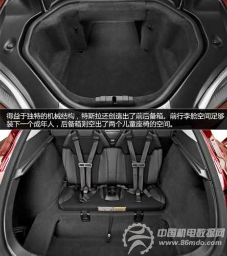 必须承认整个电池组让Model S的体重大幅增加,就算车身有95%以上采用铝材,但整车重量依然达到2.1吨。好在由于电池组和电动机都位于车底,车辆重心离地只有44厘米,依然能够牢牢地束缚在路面上。除了全新平台和全铝车身,特斯拉Model S还有另一大特色:具有前、后备箱。前面的几张图已经显示了,Model S的电池、电动机都在底盘上,因此给前后都空出了相当大的空间,当然特斯拉也没有浪费这些空间。据称车头的前备厢能挤进去一个成年人,而后备箱大到能放下两个儿童座椅,虽然这样设计安全性值得考虑,但确实说明Model S很能装。