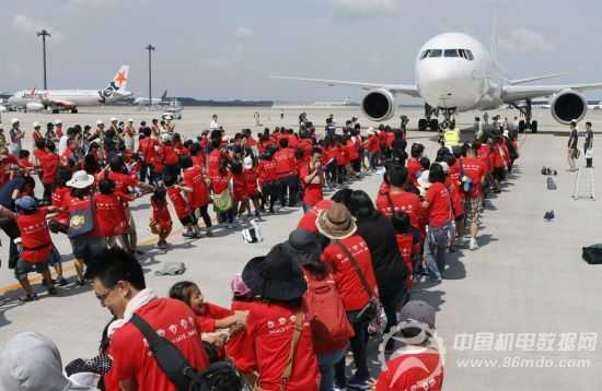 9月22日,数百名小学生和家长在日本在成田机场与波音767客机进行拔河比赛