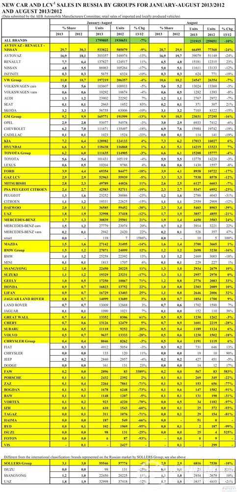 根据欧洲商会AEBRUS数据,2013年8月份,俄罗斯市场上轻型车(涵盖乘用车及轻型商用车)新车总销量为231,915辆,而2012年8月销量259,051辆,今年同比下滑10.5%。这是自从今年3月份以来,俄罗斯车市连续第6个月出现销量同比滑坡。