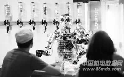 德国一家酒吧内,酒保手端一杯鸡尾酒递给顾客,所有顾客双眼紧盯酒保,或好奇,或赞赏,因为这名酒保可不是一般人,而是仿人机器人“卡尔”。