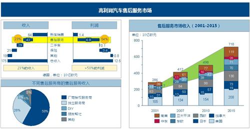 全球范围内,汽车保有量越来越多,车辆寿命越来越长,预计在2015年,售后服务业务将会从2007年的4120亿欧元增长到7180亿欧元。主要增长来源于新兴市场的新车销售带动了售后服务业的发展。
