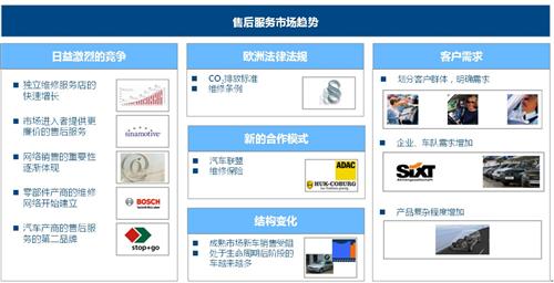 -- 客户需求: 客户对售后服务的需求快速增长。在一些新兴市场,收入的增加以及车辆的社会地位象征极大的促进了新车的销售。客户对个性化的服务需求增加,车辆复杂程度的增加使得"DIY"这种模式变得不可能。