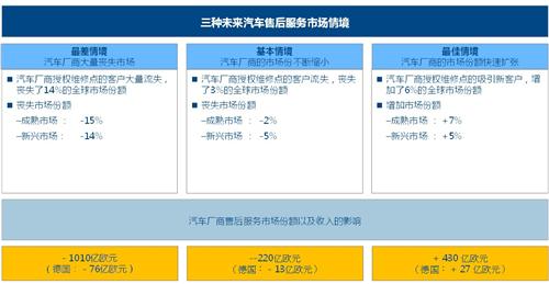 新的维修条款颁布,独立服务提供商的业务不断增长和巩固,汽车产商不断优化已有的商业模式,但并没有彻底的形成创新型商业模式,市场份额不断被新的市场进入者吞噬。在这种情形下,到2015年,汽车厂商将会丧失3%的市场份额,损失220亿欧元收入(德国损失13亿欧元)。