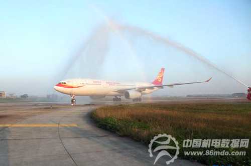 空客A330宽体机缓缓从两道绚丽水柱构建成的水门”中驶过
