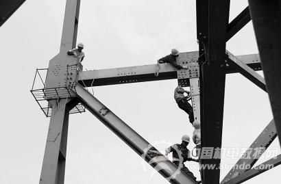 7月3日,中铁二十局工人正在黄(陵)韩(城)侯(马)铁路新黄河特大桥(河津段)拼装钢桁梁。黄韩侯铁路新黄河特大桥是黄韩侯铁路重难点工程之一,是目前国内铁路桥中最大的单跨简支钢桁梁。