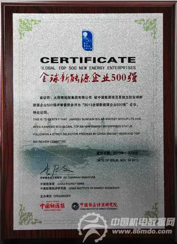 据了解,“2013全球新能源企业500强”的名单由主办方委托中国能源经济研究院在往届的评选基础上,历时一年,通过多渠道、多方式对企业财务数据进行相关的模型分析与探索评选而出,在行业内具有较强的权威性与可信度。
