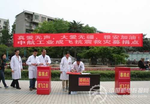 四川省雅安芦山县发生7.0级强烈地震以来,牵动了无数航空人的心。中航工业广大干部、职工群众心系灾区人民,慷慨捐款、捐物。一些在外出差、学习、参加试验的同志第一时间打来电话询问救灾具体情况,并请同事代为捐款。一些离退休老同志、职工家属也主动加入到捐款献爱心活动中来。航空人用最质朴的方式,诠释着他们对灾区人民的关爱,用实际行动展现着航空人最无私、最真诚的博爱,为灾区重建奉献绵薄之力。